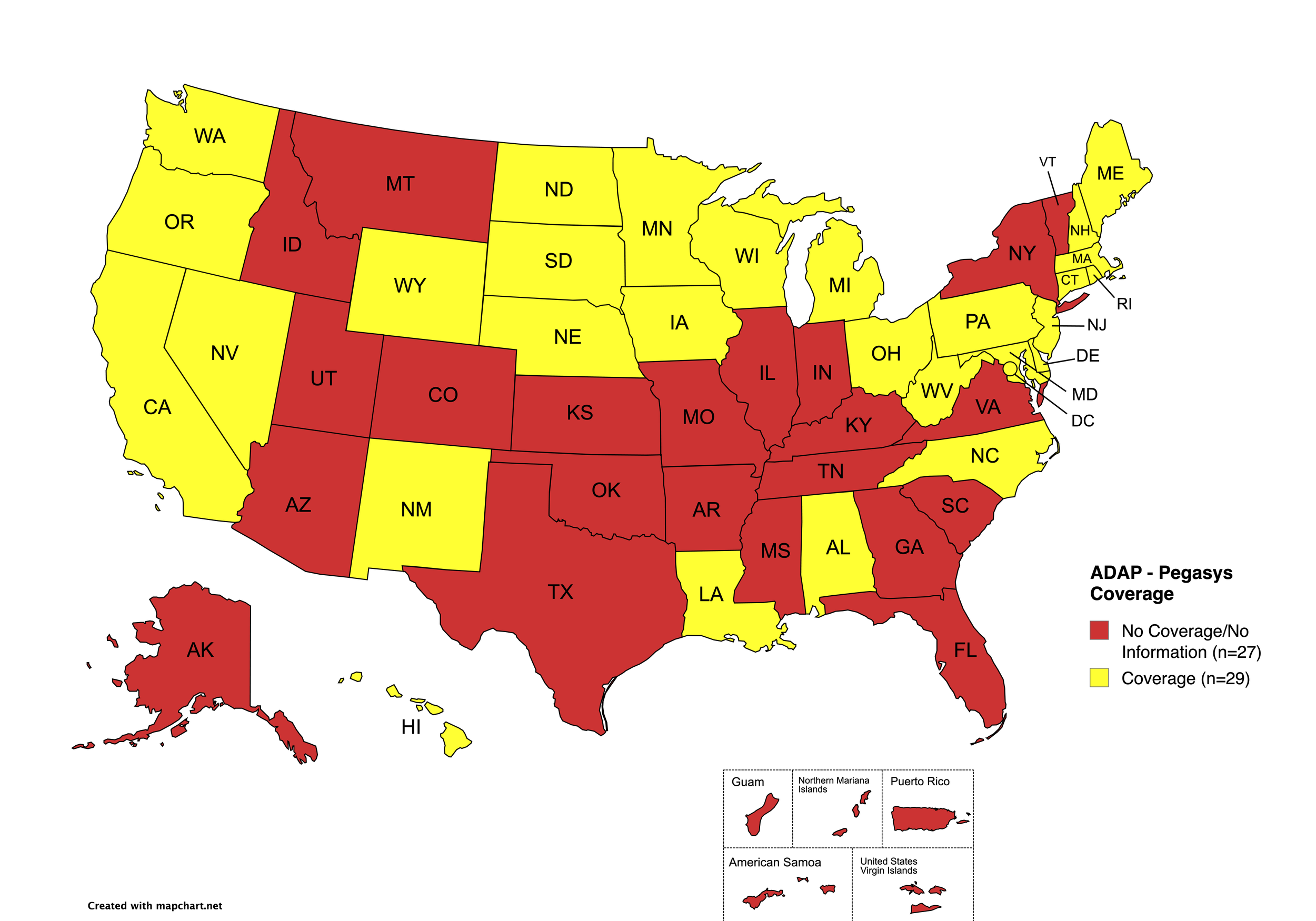 States without Pegasys Coverage: AK, AZ, AR, CO, FL, GA, ID, IN, KS, KY, MS, MO, MT, NY, OH, OK, SC, TN, TX, UT, VT, VA