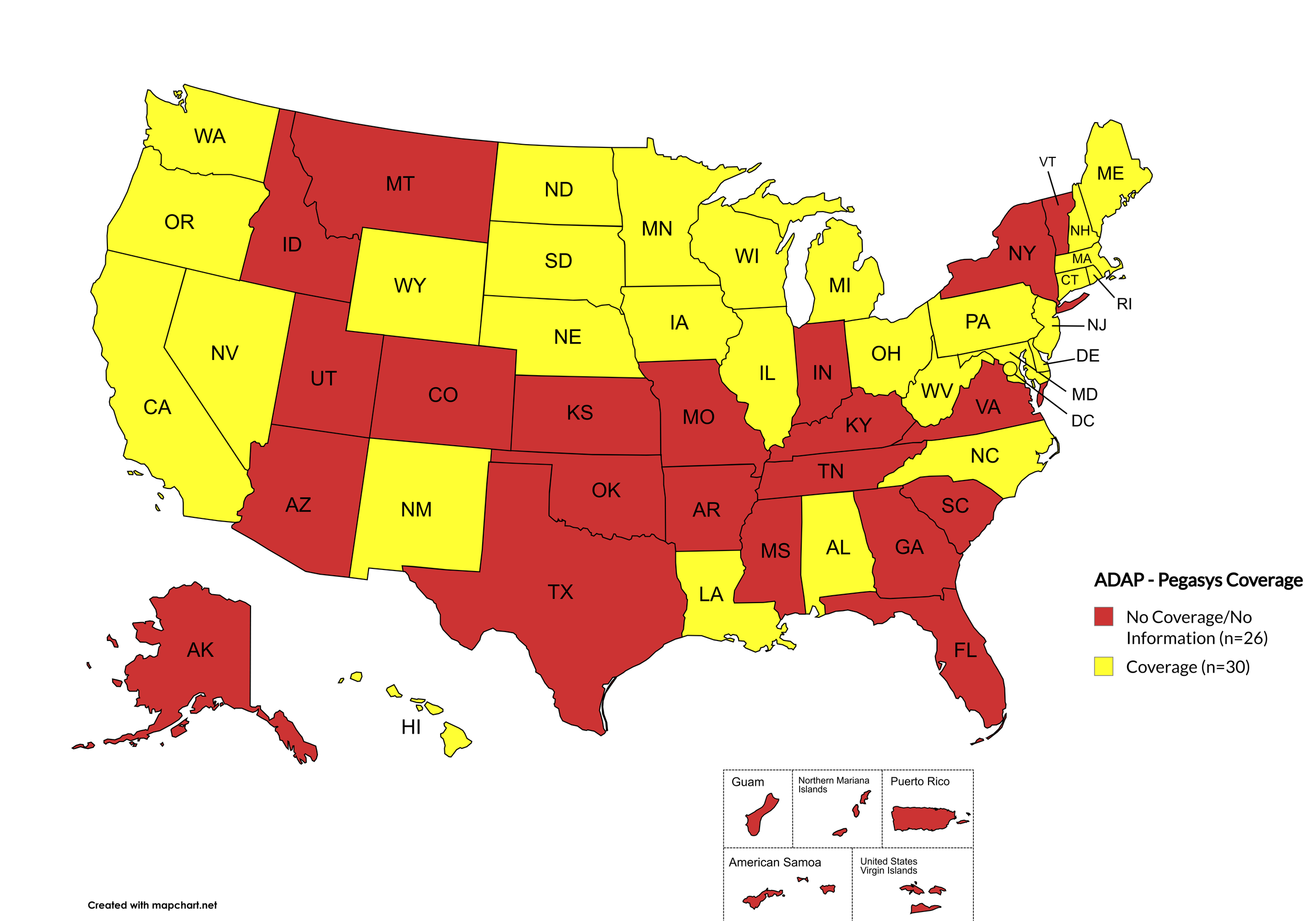 States without Pegasys Coverage: AK, AZ, AR, CO, FL, GA, ID, IN, KS, KY, MS, MO, MT, NH, NY, OH, OK, SC, TN, TX, UT, VT, VA